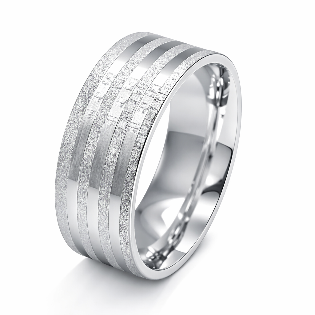 A Aliança de Prata 925 com Frisos e Acabamento Diamantado é uma joia sofisticada que combina design moderno e detalhes luxuosos. O acabamento diamantado, aliado aos frisos bem definidos, cria um efeito de brilho especial e diferenciado, refletindo a luz de forma elegante e tornando a peça ainda mais marcante.