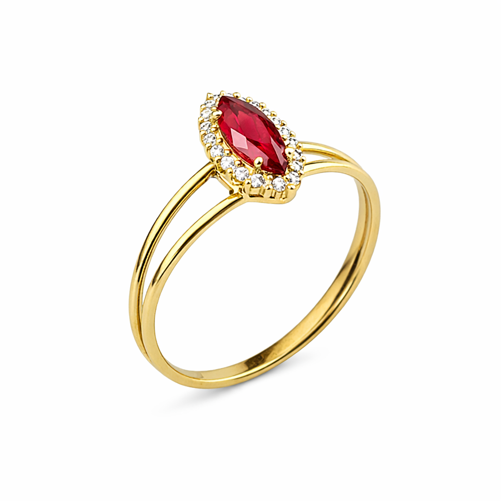 O Anel em Ouro 18K Aro Duplo com Zircônia Vermelha Navete é uma joia sofisticada e moderna, perfeita para eternizar momentos especiais. Seu design exclusivo em aro duplo garante delicadeza e charme, enquanto a zircônia vermelha navete de 5,80 mm é realçada por 18 zircônias menores, que completam o brilho e a elegância da peça.