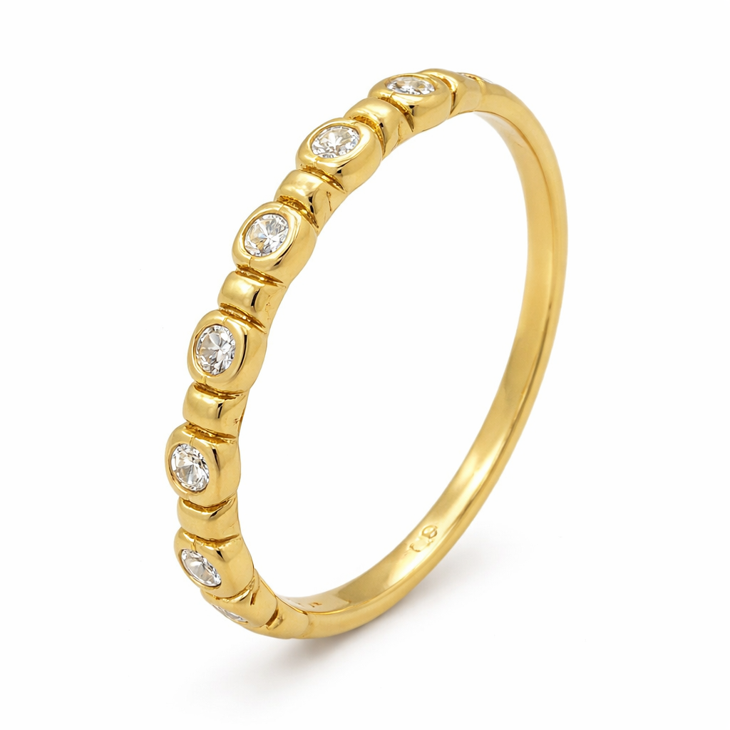 O Anel Meia Aliança em Ouro 18K com Zircônias é a escolha perfeita para compromissos e celebrações, simbolizando a união e o brilho de momentos inesquecíveis.