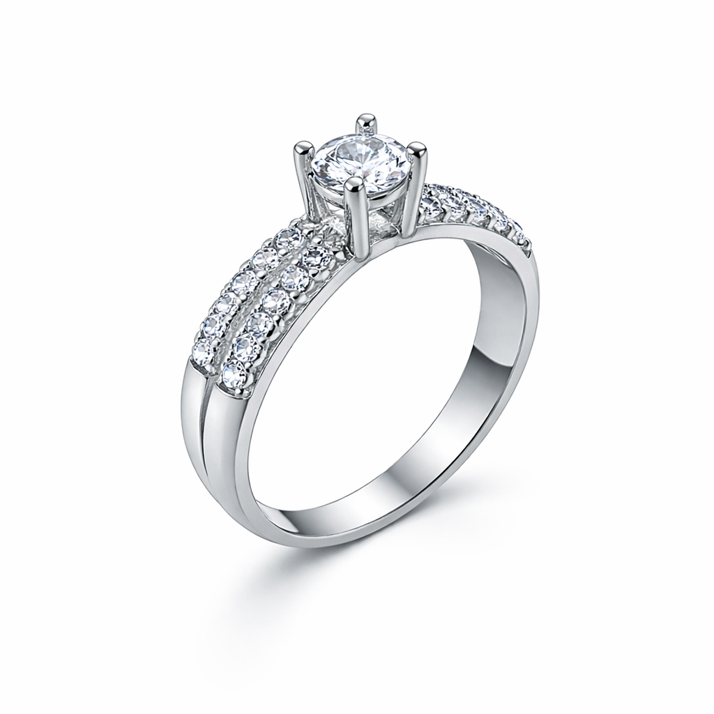 Um design sofisticado e moderno: este anel solitário em Prata 925 apresenta aro duplo, com 16 zircônias de 2,00 mm cravejadas que realçam o brilho da zircônia central de 6,00 mm. Uma joia exclusiva da Justino Ribas, perfeita para compromissos e momentos inesquecíveis.