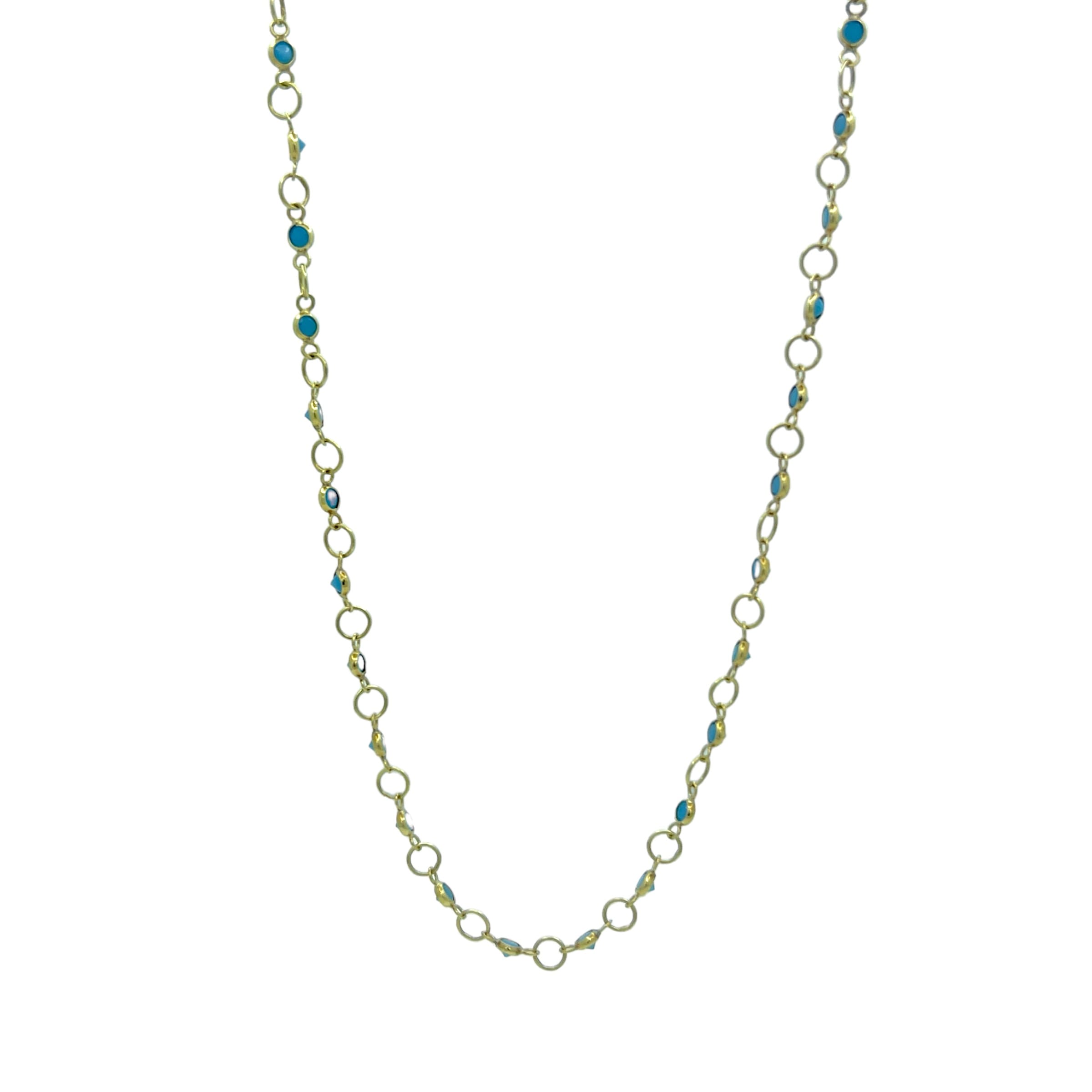 A Corrente em Ouro 18K com Turquesa é uma joia delicada e sofisticada, que une a nobreza do ouro ao charme natural da turquesa. Com seu tom azul vibrante, a pedra traz elegância e leveza, tornando esta peça ideal para iluminar seu visual em qualquer ocasião.
