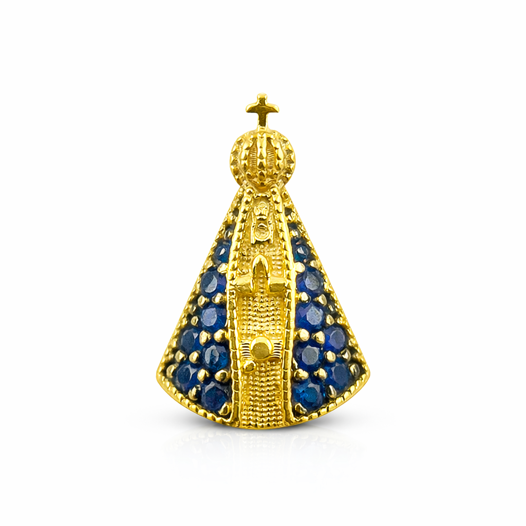 O Pingente em Ouro Amarelo 18K Nossa Senhora é uma joia que transmite fé, proteção e sofisticação. Seu acabamento polido realça o brilho do ouro, enquanto as zircônias azuis e brancas destacam a delicadeza e a beleza do design exclusivo. Uma peça que une devoção e elegância, ideal para uso pessoal ou presente especial.