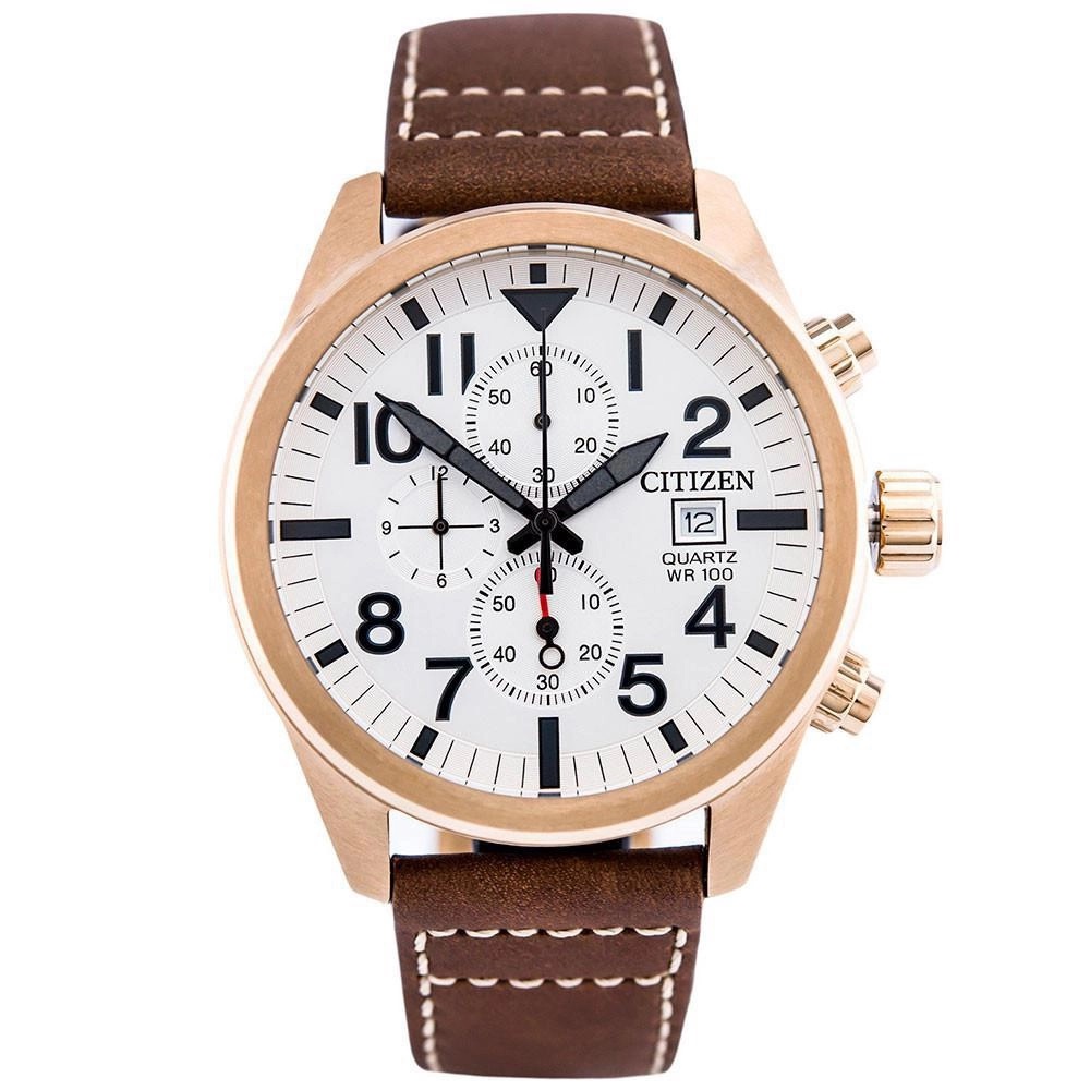 O Citizen Cronógrafo TZ31178E / AN3623-02A é um relógio que une a tradição relojoeira japonesa à sofisticação do design contemporâneo. Com caixa em aço inoxidável com acabamento em ouro rosa (Ion Plate) e pulseira em couro havana com pespontos brancos, este modelo transmite elegância refinada em cada detalhe.