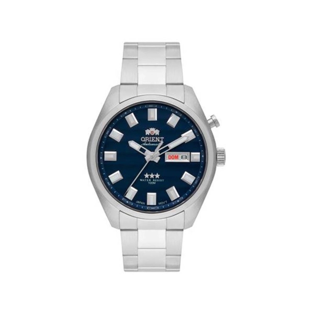 Seu design combina caixa e pulseira em aço inoxidável prateado com mostrador em tons de azul, criando um visual moderno e sofisticado. O calendário duplo com dia da semana e dia do mês reforça a funcionalidade, enquanto a resistência à água de até 100 metros o torna ideal para diferentes momentos do cotidiano.